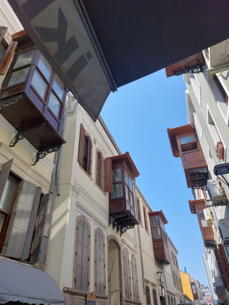 Commencez votre balade depuis le Kordon : le front de mer offre déjà ce mélange singulier d’élégance et de vie populaire. En vous enfonçant dans les rues et ruelles d’Alsancak (notamment le quartier connu sous le nom de “Punta”), vous remarquerez des rangées de maisons basses à oriels en bois, des bow-windows peints et des façades aux moulures délicates, vestiges de résidences de négociants et d’armateurs levantins. Plusieurs de ces maisons font l’objet de programmes de protection et d’études patrimoniales.