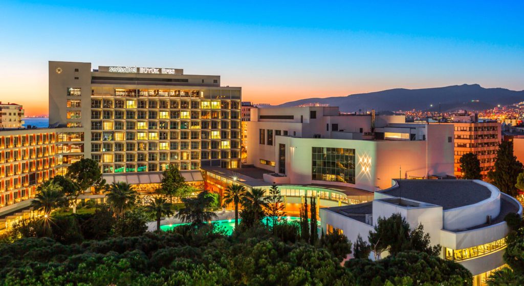 Parmi les adresses qui ont incarné le prestige d’İzmir, le Büyük Efes (souvent appelé Efes Oteli ou Grand Efes) occupe une place de premier plan. Conçu dans les années 1950 et ouvert officiellement au début des années 1964, cet hôtel symbolisa le renouveau moderne de la ville : architecture soignée, jardins et salons où se croisaient hommes d’affaires, artistes, diplomates, vedettes de passage et personnalités politiques. Le bâtiment a été conçu dans l’esprit des grands hôtels modernes d’après-guerre, tel un mélange de monumentalité et de confort raffiné, et a connu plusieurs phases de rénovation, avant de renaître, en 2008, sous l’enseigne Swissôtel Büyük Efes au XXIᵉ siècle.