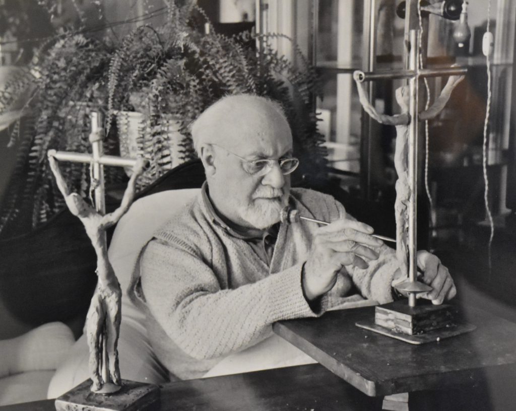 Et le trait se fait minimaliste : 84 dessins préparatoires pour Le chemin de croix jusqu’à parvenir à la simplification ultime : « Il suffit d’un signe pour évoquer un visage, il n’est nul besoin d’imposer aux gens des yeux, une bouche. » Les études de mains pour le Saint Dominique (1948-49, dessins à l’encre noire) et les études pour le Saint Dominique (1949-50, pinceau et encre de Chine) l’attestent : s’il est acté que, traditionnellement, le saint tient à la main un exemplaire de l’Évangile selon Mathieu, que seront donc ses mains ? Peut-être de longues lianes souples enserrant le cuir de l’ouvrage ? Ou de lourdes spatules indiquant la puissance potentielle de l’esprit ? Ou encore de simples esquisses étiolées ne proposant rien d’autre qu’un mouvement ? A moins qu’elles ne deviennent de véritables serres humaines s’appropriant la chair du livre. Le résultat final sera, en quelque sorte, une synthèse de toutes ces solutions.