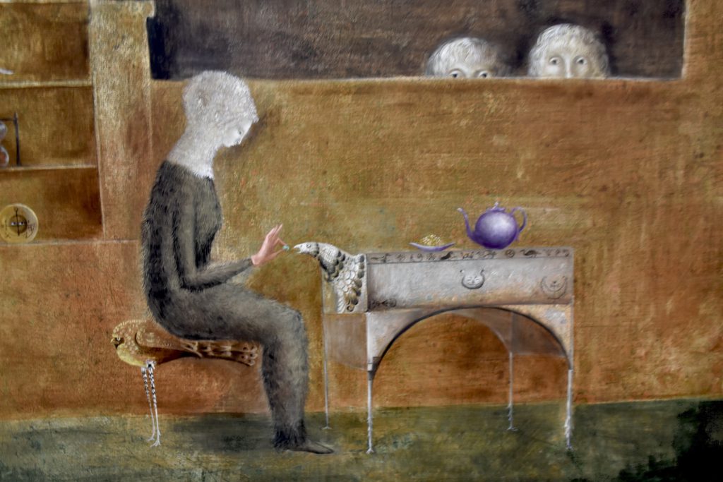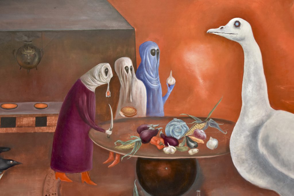 C’est au Mexique, à partir de 1942, épouse désormais de Renato Leduc, poète et diplomate, mère de famille, que Leonora Carrington va réellement s’épanouir. Elle demeure profondément et spontanément surréaliste dans son inspiration, mais elle mélange les sources, les cultures et les mythologies : dans son Echelle de Jacob de 1955, les anges sont des oiseaux, tandis que La cuisine aromatique de grand-mère Moorhead 1975 et le Petit déjeuner de chasse édouardien 1956 sont des reprises de sa culture irlandaise d’origine.