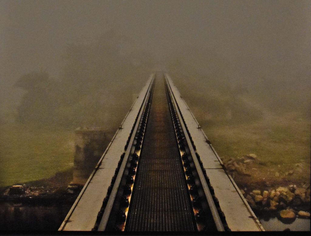 Si bien que le paysage paraît tout à la fois artificiel et naturel, empli d’une verdure luxuriante contredite par les résurgences métalliques de l’occupation humaine, tout à la fois vierge et souillée. Cela donne fréquemment des effets de dégradation post-apocalyptique, ou bien, parfois, des cocasseries (ces rails désormais inutiles, sans traverses ni ballast qui avancent à perte de vue dans le paysage, comme si l’homme Blanc était à moitié déchaussé dans son cheminement).