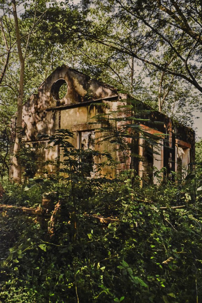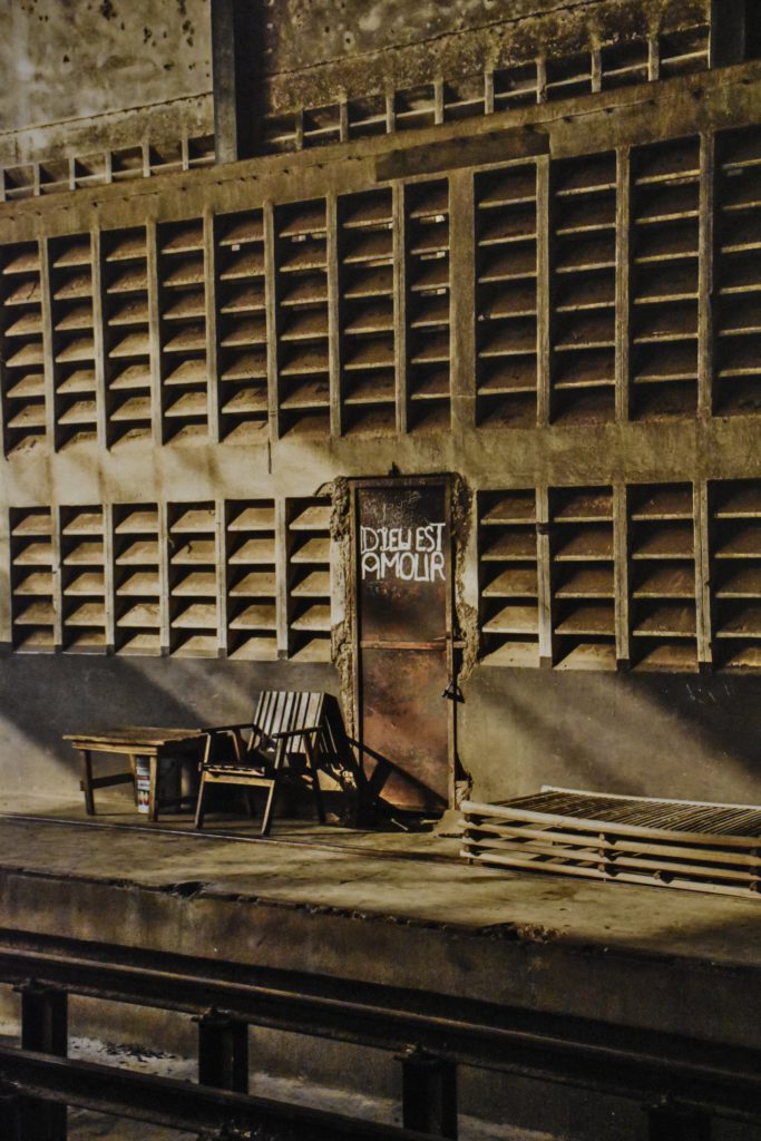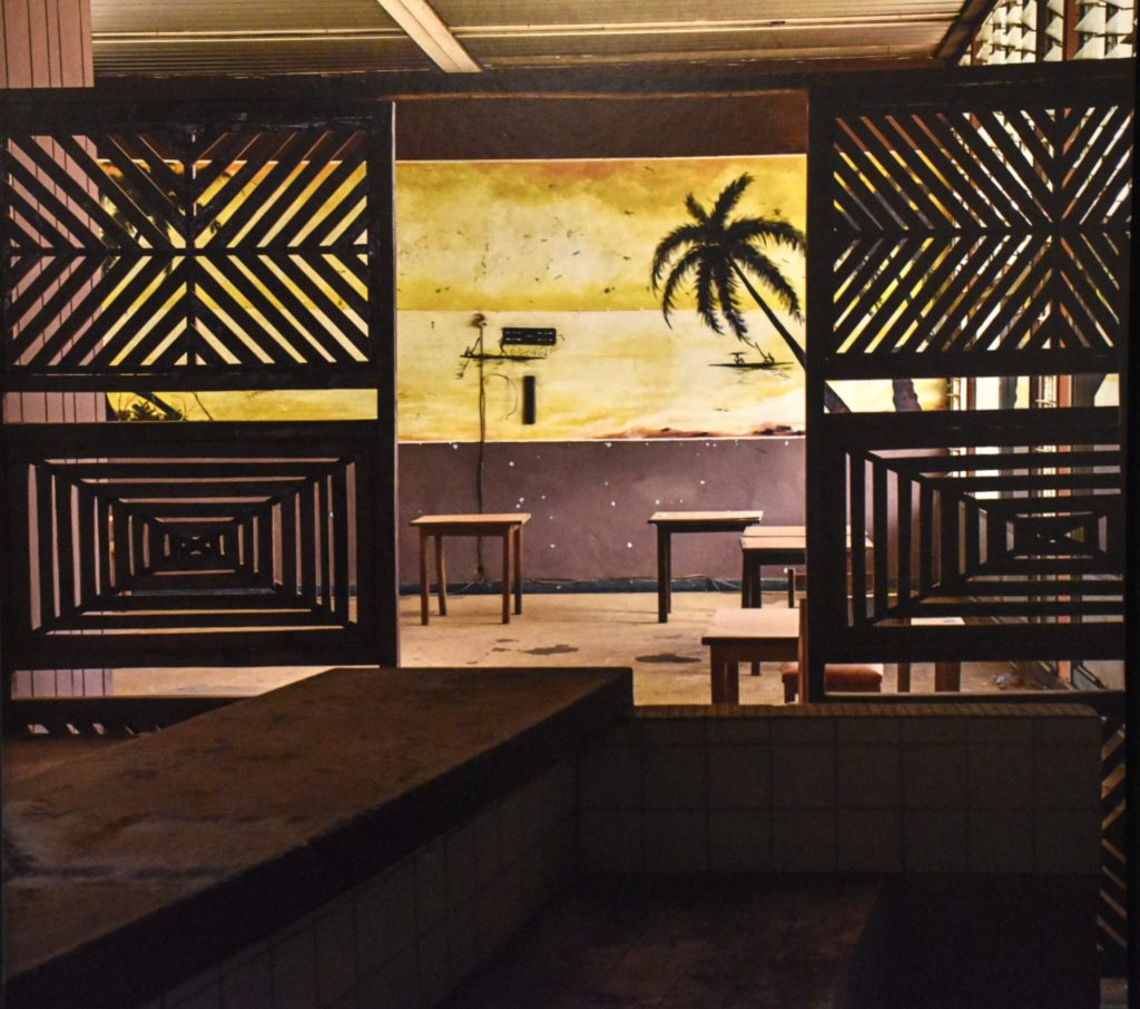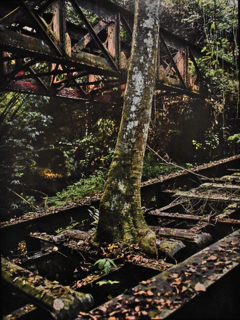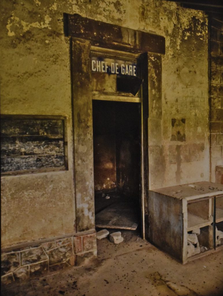 Les stigmates de la colonisation sont partout présents, mais ils ont été, peu à peu, progressivement, oubliés, délaissés, puis effacés par le retour de la nature. Un paradoxal panneau indicateur signalant la présence d’un train se trouve désormais au beau milieu des herbes folles. Les rails inutilisés s’entassent sur un quai dans un dépôt d’Abidjan, comme autant de longes de fer vouées à la rouille. Un étrange tag « Dieu est amour » orne encore la porte donnant sur un quai vide qui ne verra plus jamais passer de train. Une salle d’attente reste apparemment des plus confortables alors qu’il ne reste rien à attendre. C’est un peu à l’image de cette photo du tout début de l’exposition qui présente les rails, face à nous, plongeant vers l’avant et un lointain perdu dans la brume.