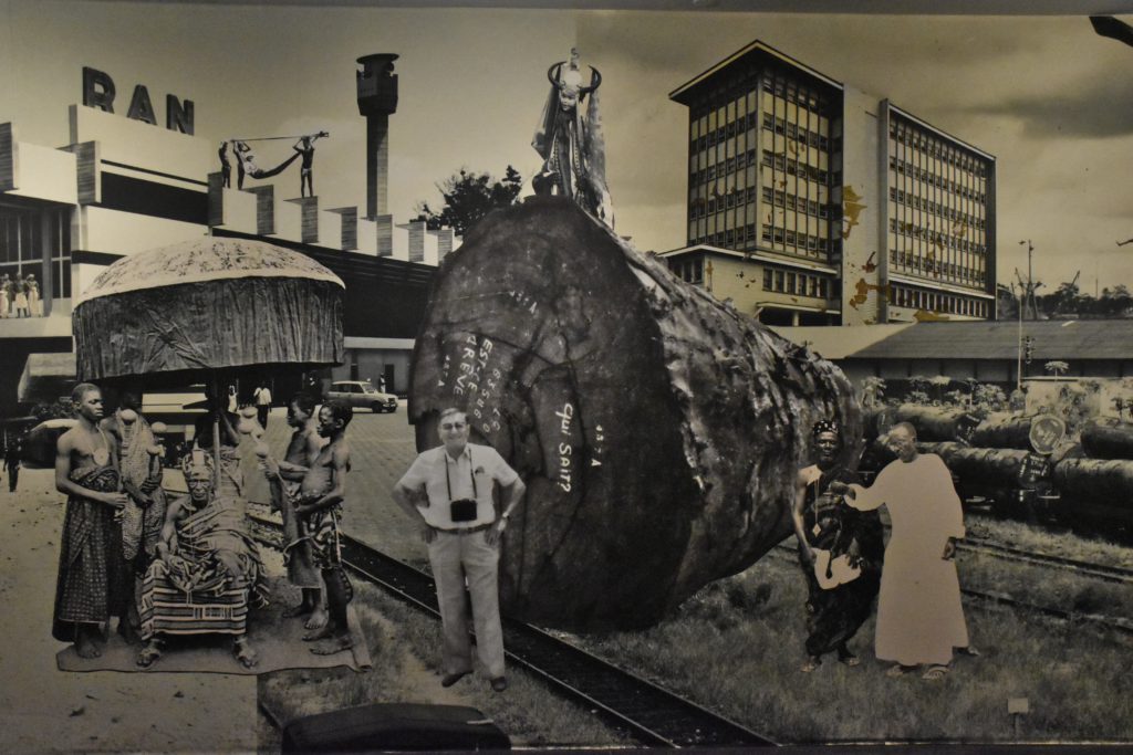 Ce qui donne une exposition en trois parties : contexte, indices et fresque. Le contexte, ce sont les photos grand format qui disent le paysage, les remarques, les annotations les plus parlantes. Les indices, ce sont, en petit format, un certain nombre de détails révélateurs du cheminement : un nom de gare, une indication (section Molonou, position avancée), une date (1910), une affiche oubliée, un entremêlement métallique légèrement effrayant… Et puis la fresque, un immense collage sur un mur tout entier, dans lequel Gbré récupère les photos d’un certain Louis Normand, Français installé en Côte d’Ivoire à la pleine époque de la colonisation (le miracle ivoirien des années 70), des cartes postales et des images traditionnelles du pays.